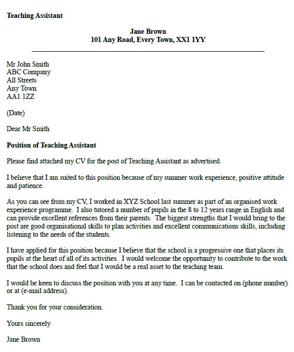 View this sample cover letter for a teaching assistant, or download the teaching assistant cover letter template in word. A resume without a convincing cover letter makes little impact and a specific, personalized cover letter that highlights your suitability for the job will grab the reader's attention and ensure your resume gets serious. A good cover letter for a teacher assistant position relates your teacher assistant skills to the employer's needs while encouraging the hiring manager to learn more about you through the attached resume. Check out this great example cover letter to help you get started writing your own.