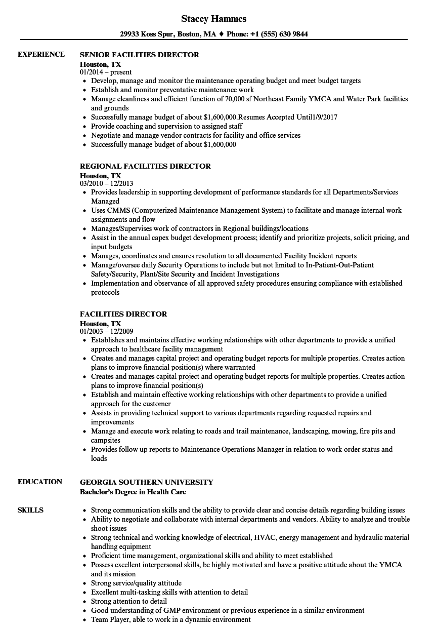 Write the perfect resume with help from our resume examples for students and professionals. Use professionally written and formatted resume samples that will get you the job you want. In this file, you can ref resume materials for facilities such as resume tips, resume samples, cover letter samples, types of interview questions, facilities situational interview, facilities behavioral. Creating a perfect director of facilities resume has never been that easy!